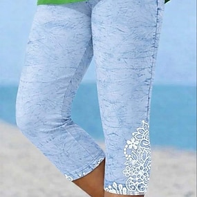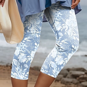 Women's Leggings Capri Pants High Elasticity Vacation Fashion Hawaiian Calf-Length Mid Waist Floral Graphic Printing Breathable Soft Vacation Casual Daily Lake blue Summer Spring Regular Fit