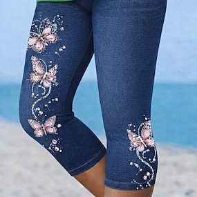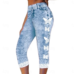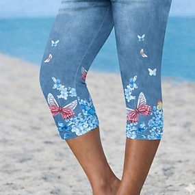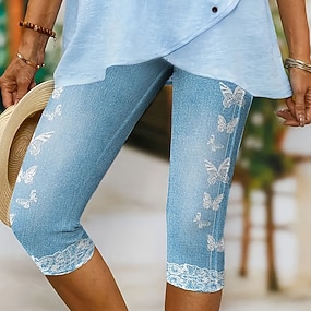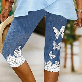 Women's Capri Pants Leggings Vacation Fashion Hawaiian Calf-Length Mid Waist Floral Graphic Butterfly Printing Print Comfort Soft Breathable Stretchy Casual Daily Vacation Blue Summer Spring Slim Fit