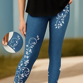 Women's Leggings Vacation Vintage Fashion Full Length High Waist Floral Graphic Printing Soft Breathable Stretchy Daily Vacation Street Blue Fall Winter Slim Fit