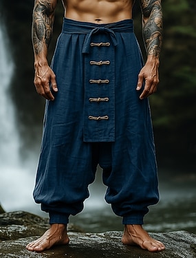 Men's Linen Pants Trousers Summer Pants Baggy Pants Drawstring Elastic Waist Buttons Plain Comfort Breathable Full Length Outdoor Yoga Casual Designer Retro Vintage Red Navy Blue Inelastic