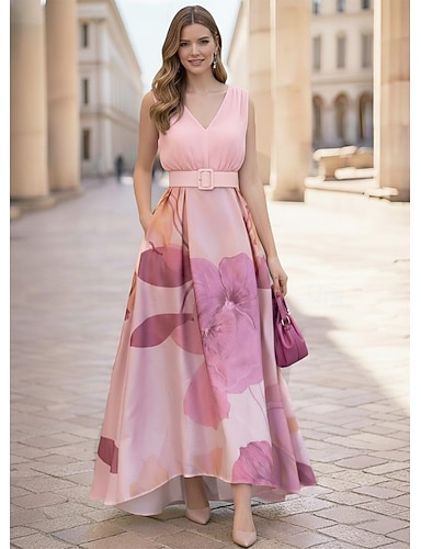 A-Line Floor Length Evening Gown Elegant Sleeveless V Neck Wedding Formal Pocket Chiffon Satin with Floral Print Pleats Ruched