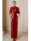 Red Formal Cape Dress Gown Sheath / Column Evening Gown Elegant Formal Dress Formal Wedding Floor Length Sleeveless Crew Neck Stretch Satin with Pleats and Shoulder Flower 2025