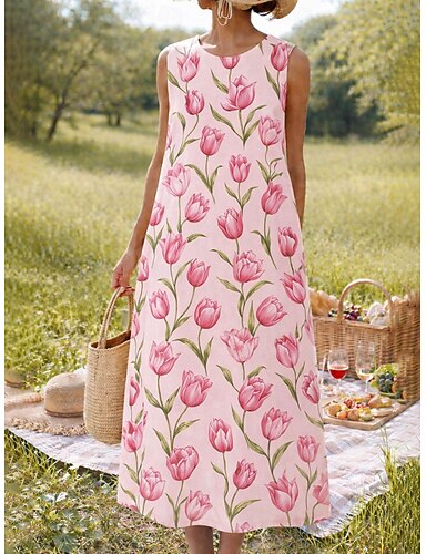 Women's Midi Dress Shift Dress Sundress A Line Dress Vacation Casual Boho Beach Party Loose Fit Floral Graphic Sleeveless Crew Neck Blue Pink Orange Green Summer Spring