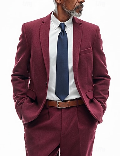 Men's Business Casual Tweed Suits Notch Lapel Black Burgundy Formal Solid Colored Tailored Fit 2 Piece Single Breasted One-button