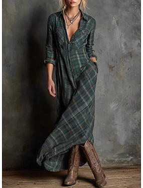 Women's Maxi Dress Sheath Dress Work Dresses Fit And Flare Dress Vacation Party Casual Party Office Birthday Regular Fit Graphic Geometric Plaid Long Sleeve Lapel White Red Green