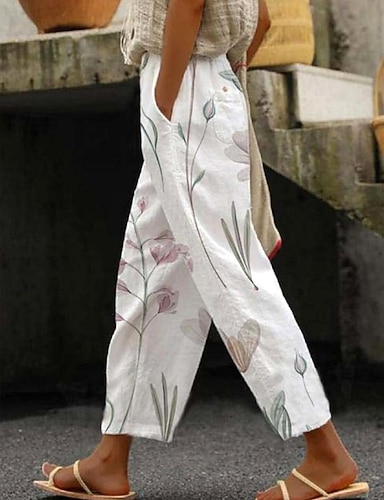 Women's Cotton Linen Pants Baggy Pants Linen Like Vintage Casual Ankle-Length Floral Drawstring Side Pockets Print Comfort Inelastic Casual Daily White Summer Spring Fall Regular Fit