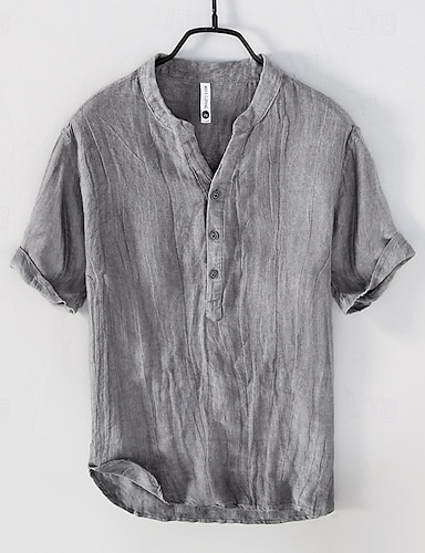 Men's Linen Shirt Summer Shirt Beach Wear Casual Shirt Band Collar Shirt Solid Color Casual Daily Black White Light Green Blue Short Sleeve Henley Summer Spring Clothing Apparel Button-Down