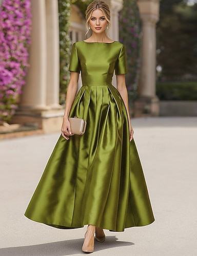 A-Line Tea Length Cocktail Dresses Elegant Short Sleeve Boat Neck Garden Party Wedding Taffeta Stretch Satin with Pleats
