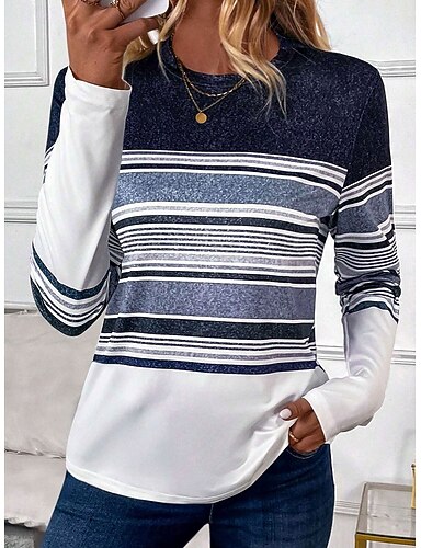 Women's T shirt Long Sleeve Crew Neck Long Sleeve Tunic Striped Casual Regular Tops Daily Print Blue Spring Fall Prefall