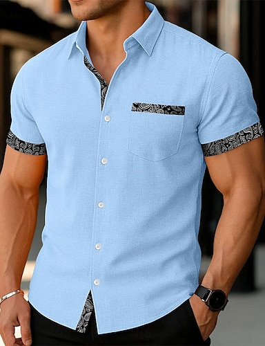 Pánské Geometrický Lněná košile Havajská košile Košile na knoflíky Krátký rukáv Vinobraní umělecké Dovolená Oblečení na pláž Léto Jaro Přehnutý Barevné bloky Vodní modrá Trávová zelená