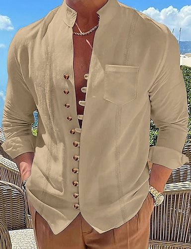 Pánské Košile Lněná košile Letní košile Plážová košile Pevná barva Dovolená Denní nošení Vodní modrá Černá Bílá Khaki Dlouhý rukáv Stojáčkový límec Jaro léto Oblečení Nabírané šaty