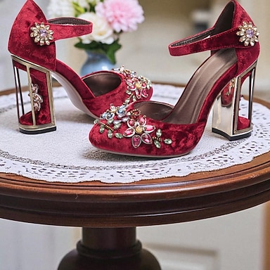Dámské červené lodičky s květinovou výšivkou a perlami a drahokamy - chunky blokové podpatky inspirované vintage Gatsby pro zvláštní příležitosti svatby a večírky
