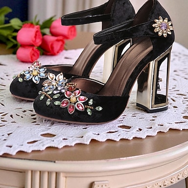 Ženské blokové podpatky zdobené stříbrným barokem pro Mardi Gras - vintage boty s kotníkovým páskem posázené krystaly pro benátský karneval maškarní bály a kostýmové akce