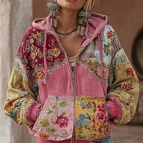 Dámské Zimní bunda Fleecová bunda Zahřívací Lehká váha Tisk Podšité fleecem Vinobraní Denní Boho vinobraní Květinový Dovolená Ležérní Krátké Kapuce Běžný Dlouhý rukáv Svrchní oděvy Trávová zelená