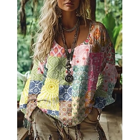 Dámské Košile Boho košile Halenka Tisk Grafika Geometrický Čechy stylové Klasické Dlouhý rukáv Do V Běžné topy Denní Dovolená Jdeme ven Trávová zelená Léto Jaro Podzim