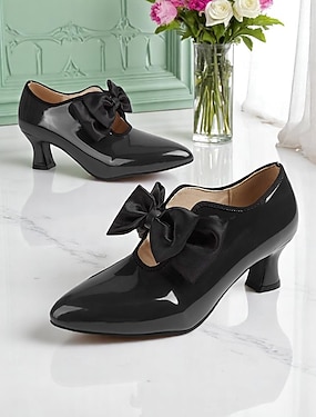 dámské černobílé lodičky na podpatku s mašlí – boty na nízkém podpatku inspirované vintage pro kancelářské, neformální i společenské příležitosti