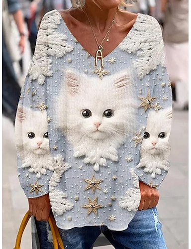 Dámské Tričko Grafika Zvíře Kočka Elegantní Vinobraní Módní Dlouhý rukáv Do V Běžné topy Denní Víkend Tisk Světlá růžová Vodní modrá Fialová Jaro Podzim