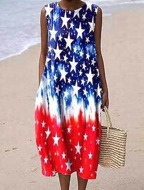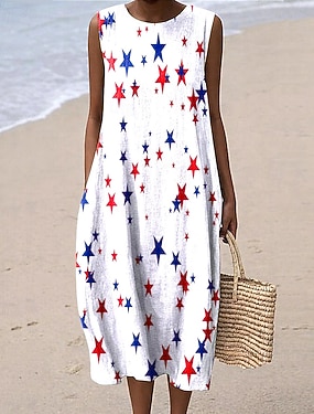 Americký den nezávislosti Dámské Midi šaty Úpletové šaty Letní šaty prázdniny Na běžné nošení Venkovní Volný Hvězdy a pruhy Bez rukávů Výstřih ke krku Modrá a bílá Oceánová modř Červenomodrá Léto Jaro