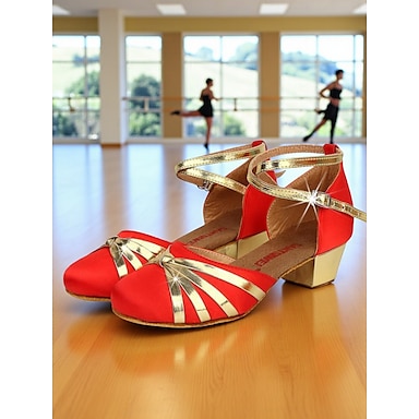 Dámské dívčí červeno-zlaté boty na latinskoamerické tance - nízké podpatky pro profesionální společenské taneční boty pro děti &trénink a výkon teenagerů
