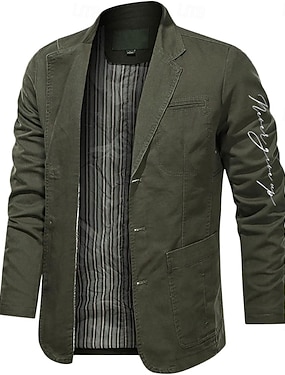 pánské bavlněné sako s potiskem písmen, obleky, kabát, sako, ležérní, outdoor, denní nošení, dlouhý rukáv, klopový límec, kapsy, knoflíky, proužky, podšívka, podzim/zima, černá, khaki, armádní zelená