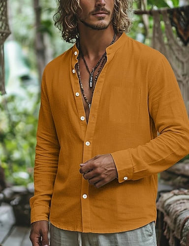 Pánské Košile Lněná košile Letní košile Plážová košile Košile na knoflíky Bez vzoru Dovolená Denní nošení Vodní modrá Černá Bílá Žlutá Dlouhý rukáv Stojáček Léto Jaro Oblečení