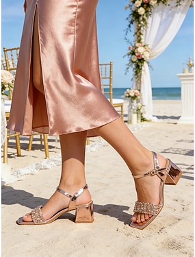 Sandály na blokovém podpatku v barvě šampaňského a růžového zlata pro družičky – kovový pásek přes kotník s čtvercovou špičkou, svatební podpatky s třpytivým kamínkovým páskem, nízké společenské boty na robustním podpatku pro svatební večírek, ples a form
