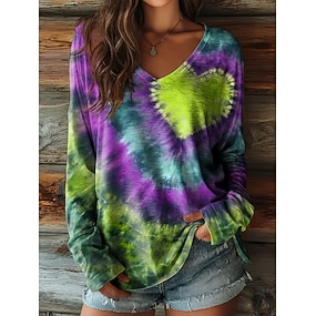Dámské Tričko Tisk Srdce Batikované Vinobraní Na běžné nošení Cikánský Dlouhý rukáv Do V Běžné topy Denní Vodní modrá Žlutá Rubínově červená Fialová Trávová zelená Jaro Podzim