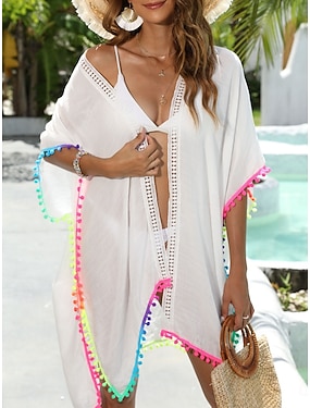 Dámské krycí plavky šaty s třásněmi dovolená plážové oblečení jednobarevné V-krk krátké rukávy