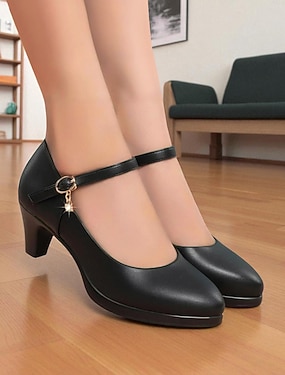 Dámské černé lodičky na úzkém podpatku s přezkou – pracovní boty z umělé kůže ve vintage stylu pro kancelářský outfit a outfit na pivní festival