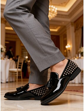 Pánské černé lakované mokasíny – stylové nazouvací boty s cvočky a moderním designem, ideální na večerní vycházky, večírky, módní akce a svatby