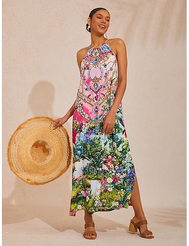 Saténové maxi šaty s tropickým botanickým potiskem a rukávy Dolman