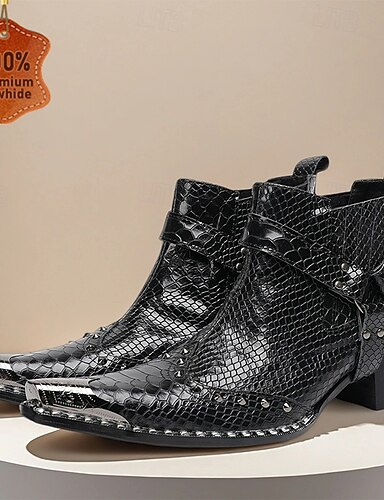 Pánské černé motocyklové boty Harley s hadím vzorem, špičatou špičkou, kovovou špičkou a přezkou přes kotník, krátké boty ve westernovém rockovém stylu pro motorkáře, koncerty, večírky a večerní zábavu.