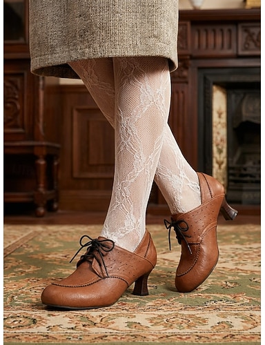 Dámské vintage edwardiánské šněrovací oxfordské boty na podpatku - elegantní hnědé boty brogue se sošným středním podpatkem pro retro outfity, akademický styl &podzimní oblečení do kanceláře