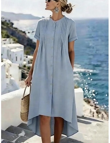 Dámské Midi šaty Imitace bavlny a lnu Áčkové šaty Na běžné nošení Denní Volný Bez vzoru Krátký rukáv Rolák Vodní modrá Bílá Žlutá Trávová zelená Léto Jaro Podzim