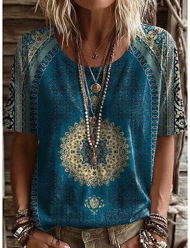 Dámské Tričko Tisk Květinový Grafika Geometrický Vinobraní stylové Na běžné nošení Krátký rukáv Do V Dlouhé topy Ležérní Denní Víkend Vodní modrá Černá Rubínově červená Léto Jaro