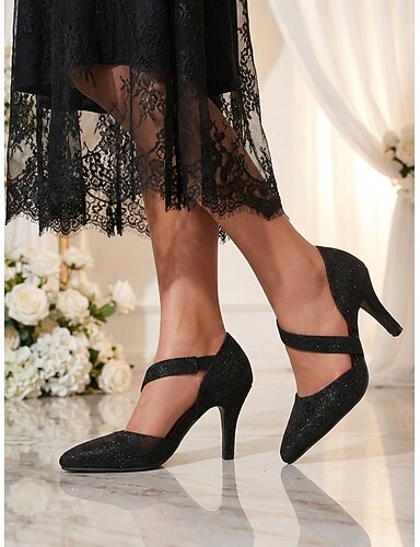 Dámské černé třpytivé boty Mary Jane na podpatku - elegantní šaty s špičatou špičkou pro matku nevěsty, svatba ve městě &formální události