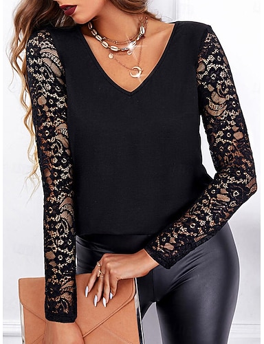Dámské Krajkový sestřihový top Halenka Slátanina Pevná barva Elegantní Módní stylové Dlouhý rukáv Do V Běžné topy Denní Jdeme ven Víkend Černá Léto Jaro