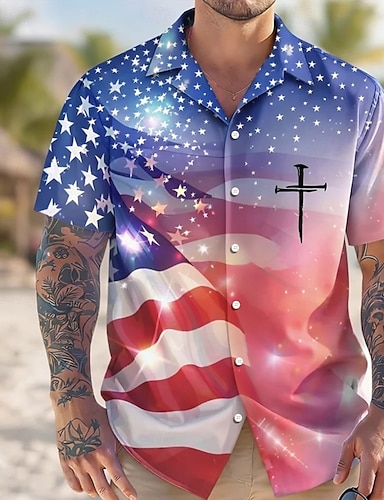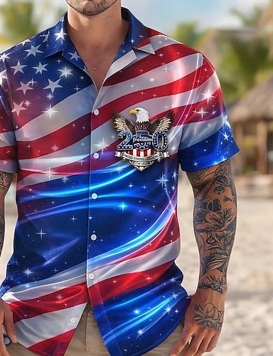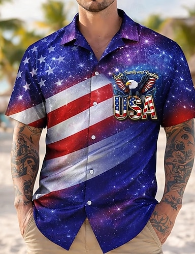 Pánské Haç Vlajka USA 250. výročí Spojených států Košile Košile na knoflíky Krátký rukáv Vlastenec Venkovní Dovolená Léto Jaro Přehnutý 3D tisk košile s límečkem Vodní modrá Fialová Hnědá