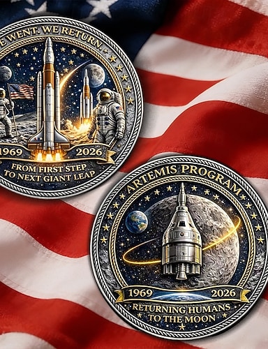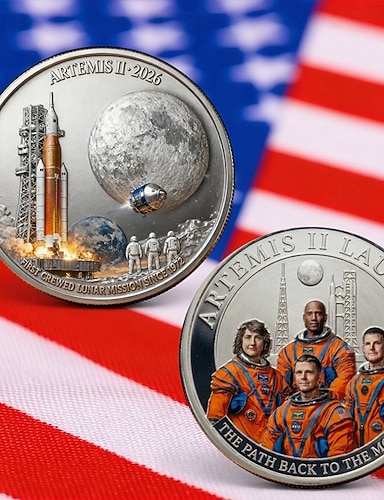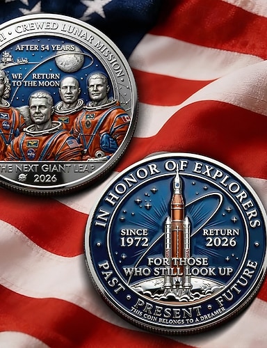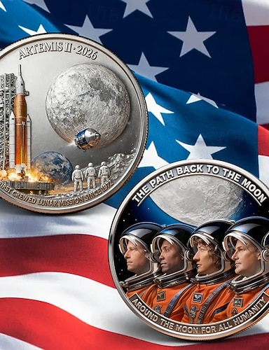 Pamětní mince Artemis II., lunární mise 2026, pocta Zemi Měsíci, sběratelský předmět pro astronauty a rakety, historická památka na přistání na Měsíci