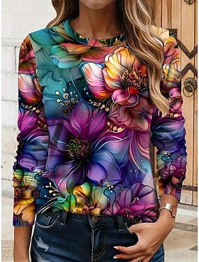 Dámské tričko s kulatým výstřihem dlouhým rukávem tunika květinová grafika rostliny vintage stylové klasické kulatý výstřih pravidelné topy denní tisk žlutá červená modrá fialová zelená podzim