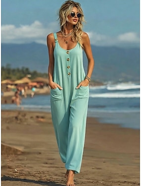 Dámské Běžný Kombinéza Aktivní Pevná barva Bez rukávů Široké nohavice Kulatý Knoflíky Denní Plážové Volný Černá Bílá Trávová zelená Léto