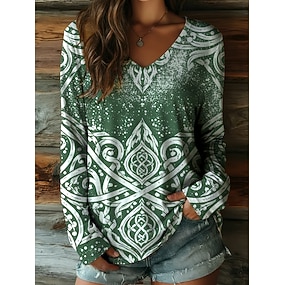 Dámské Boho košile Tričko Tisk Grafika Čechy Vinobraní Na běžné nošení Dlouhý rukáv Tričkový Běžné topy Denní Víkend Oblečení na dovolenou Trávová zelená Léto Jaro Podzim