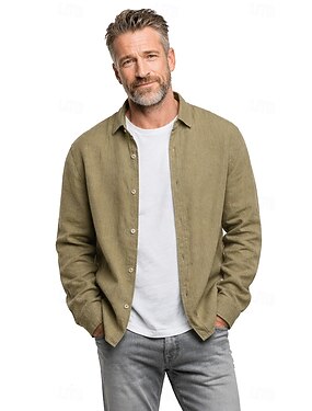 Pánská lněná ležérní bunda s kapucí, lehká khaki – 100% lněný prodyšný svrchní oděv