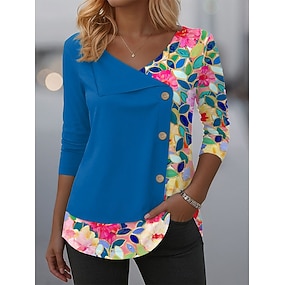 Womenská blůza tunika V krk dlouhý rukáv knoflíky květinová grafika vintage módní stylová kulatý krk standardní vrchní denní patchwork tisk modrá fialová zelená léto jaro podzim zima