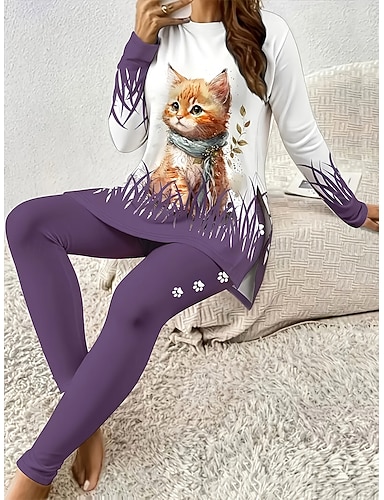 Dámské Elegantní prázdniny Módní Tričko Sady kalhot Dlouhý rukáv Tričkový Kulatý Grafika Zvíře Kočka Tisk Ležérní Denní Běžné / Denní Vínová Jaro Běžný