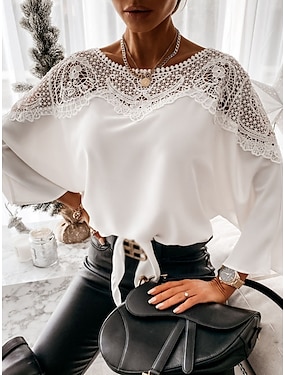 Dámské Košile Halenka Krajka Slátanina Pevná barva Základní Na běžné nošení Dlouhý rukáv Tričkový Běžné topy Denní Černá Bílá Podzim Zima