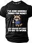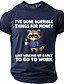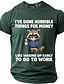 Pánské tričko s nápisem „Udělal jsem hrozné věci pro peníze“, vtipné tričko s krátkým rukávem a kulatým výstřihem s obrázkem mývala, unavený mýval pije kávu, kancelářský humor, sarkastický dárek pro
