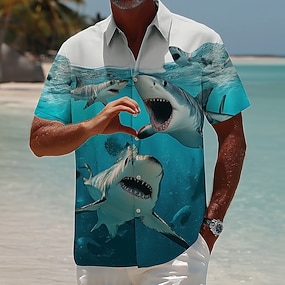 Pánské Zvíře Žralok Tvar srdce Košile Havajská košile Tropické košile Krátký rukáv Havajské Legrační Plážová dovolená Léto Jaro Přehnutý 3D tisk košile s límečkem Vodní modrá Světle modrá