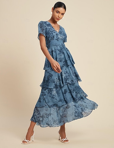 šifon svatební host květinové maxi šaty s výstřihem do V s krátkým rukávem