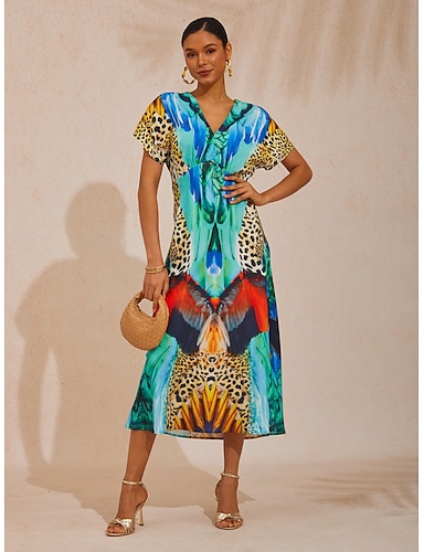 Dámské Košilové šaty Šaty s potiskem Maxi šaty Trávová zelená Tygří Rozbalte rukávy Flitry Léto Košilový límec Levhartí potisk S M L
